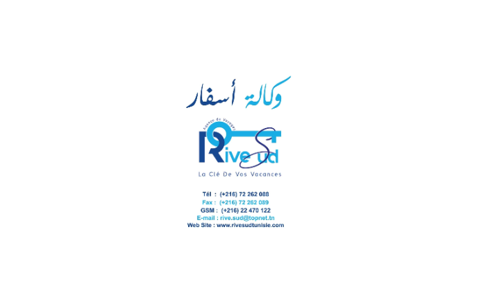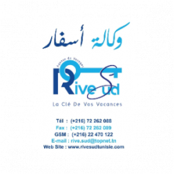 وكالة اسفار Rive Sud La Clé de Vos Vacances Avenue Habib Bourguiba 8050 Hammamet Tous séjours en Tunisie et à l'étranger , Individuels, Groupes et Incentive , Infos & contacte : Office : +216 72 262 088 GSM : +216 22 470 122 E-mail : rive.sud@topnet.tn